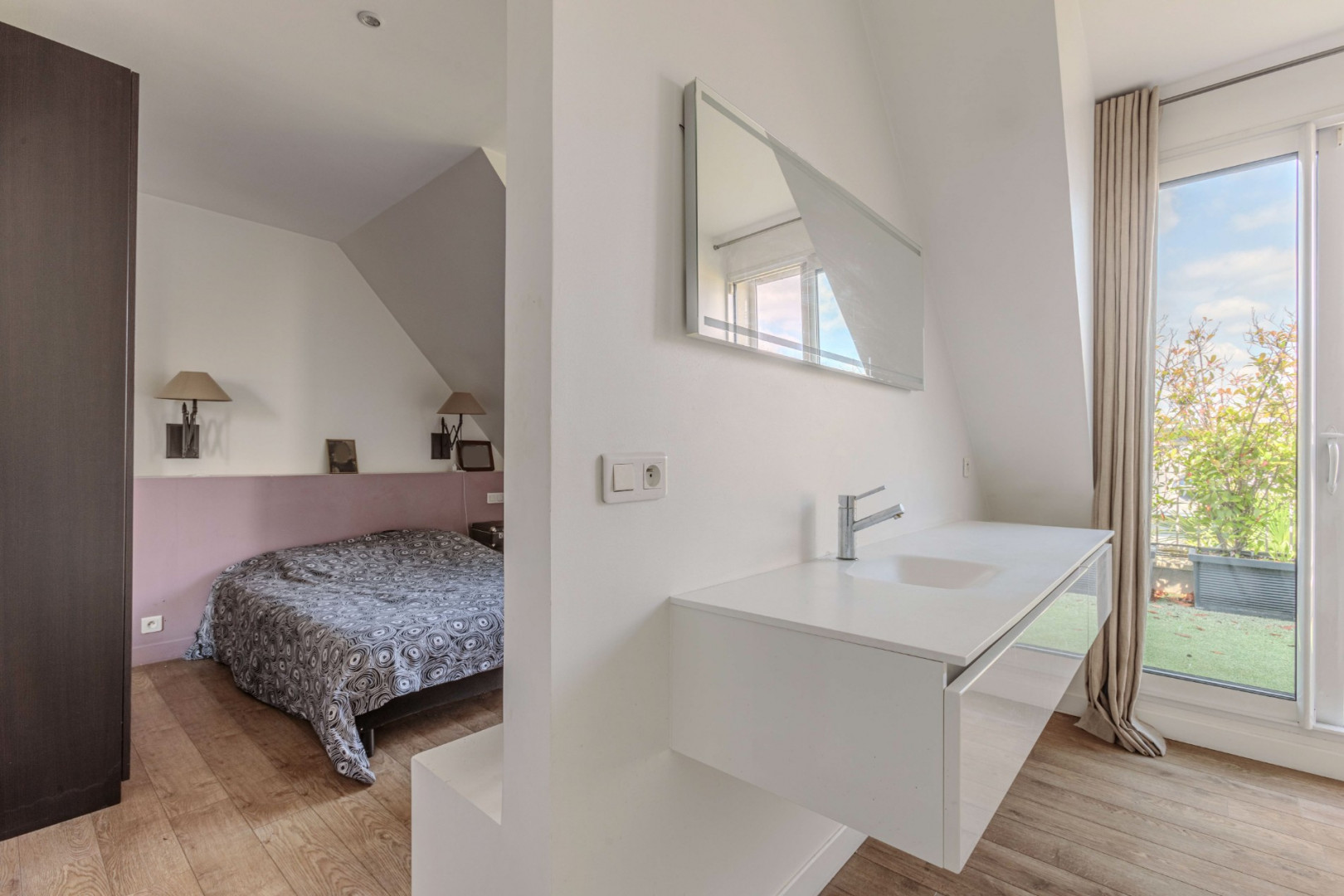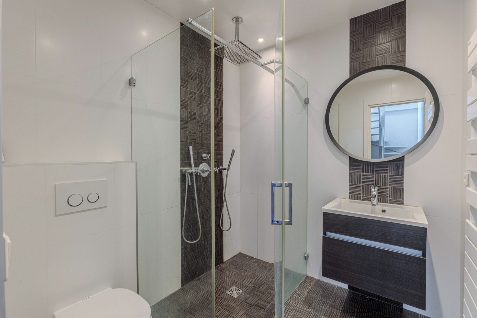 La salle d’eau est équipée d’une douche à l’italienne, alliant modernité et élégance.