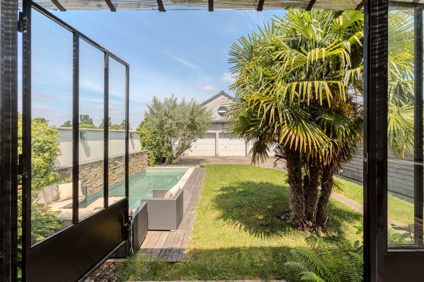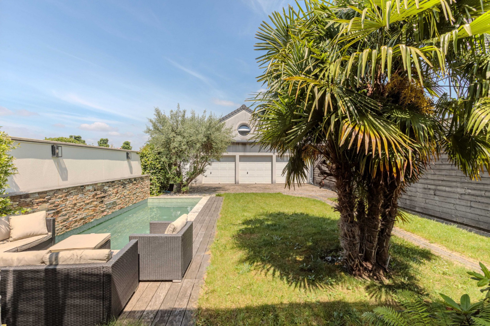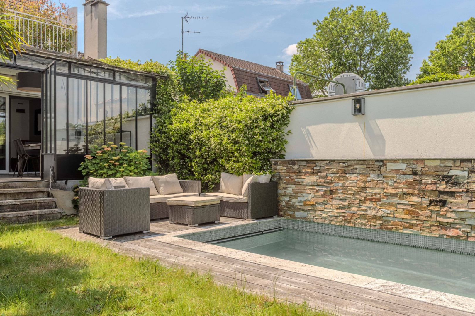 Le jardin, véritable havre de paix, abrite une superbe piscine, idéale pour les chaudes journées d’été.