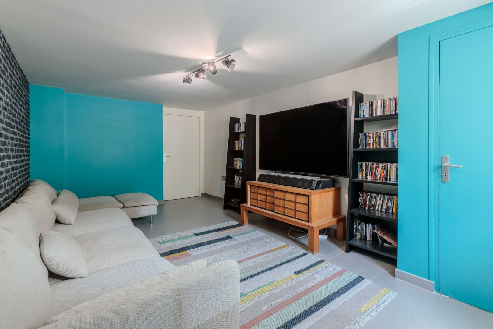 Le sous-sol, entièrement carrelé, propose un espace multifonctionnel avec une buanderie et une salle de cinéma. Une entrée indépendante à ce niveau offre la possibilité de créer un studio autonome, parfait pour accueillir des invités ou pour une utilisation locative.