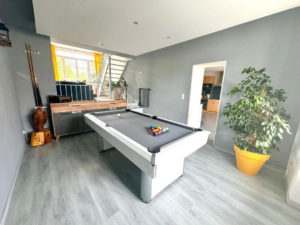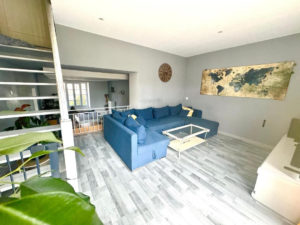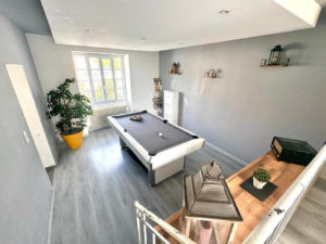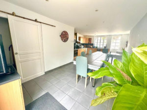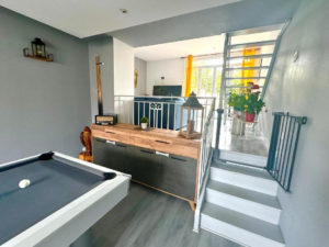 Elle se compose, au rez-de-chaussée, d’une grande salle à manger de 35 m2 avec cuisine ouverte aménagée et ilot central, d’un salon-séjour de plus de 32 m2 sur deux niveaux et accès direct sur terrasse, d’une première chambre, d’une salle de douche et d’un wc.
