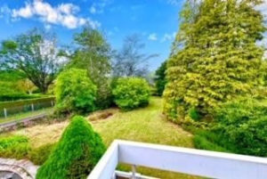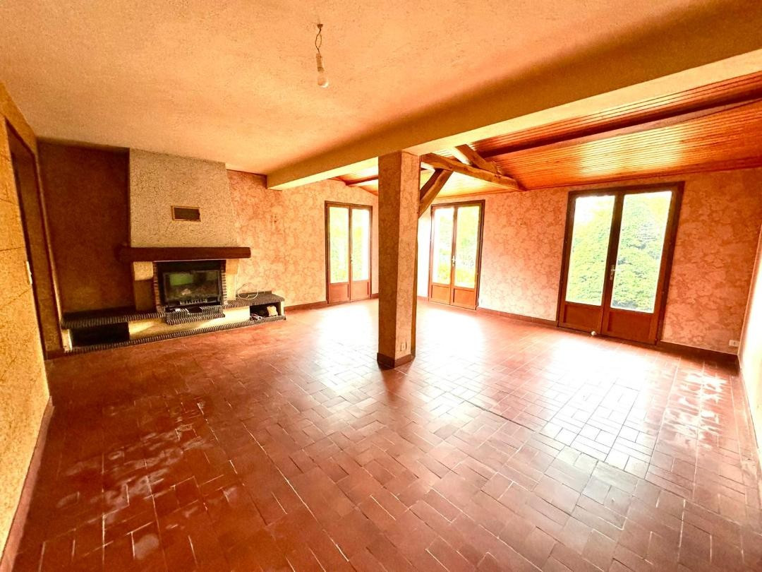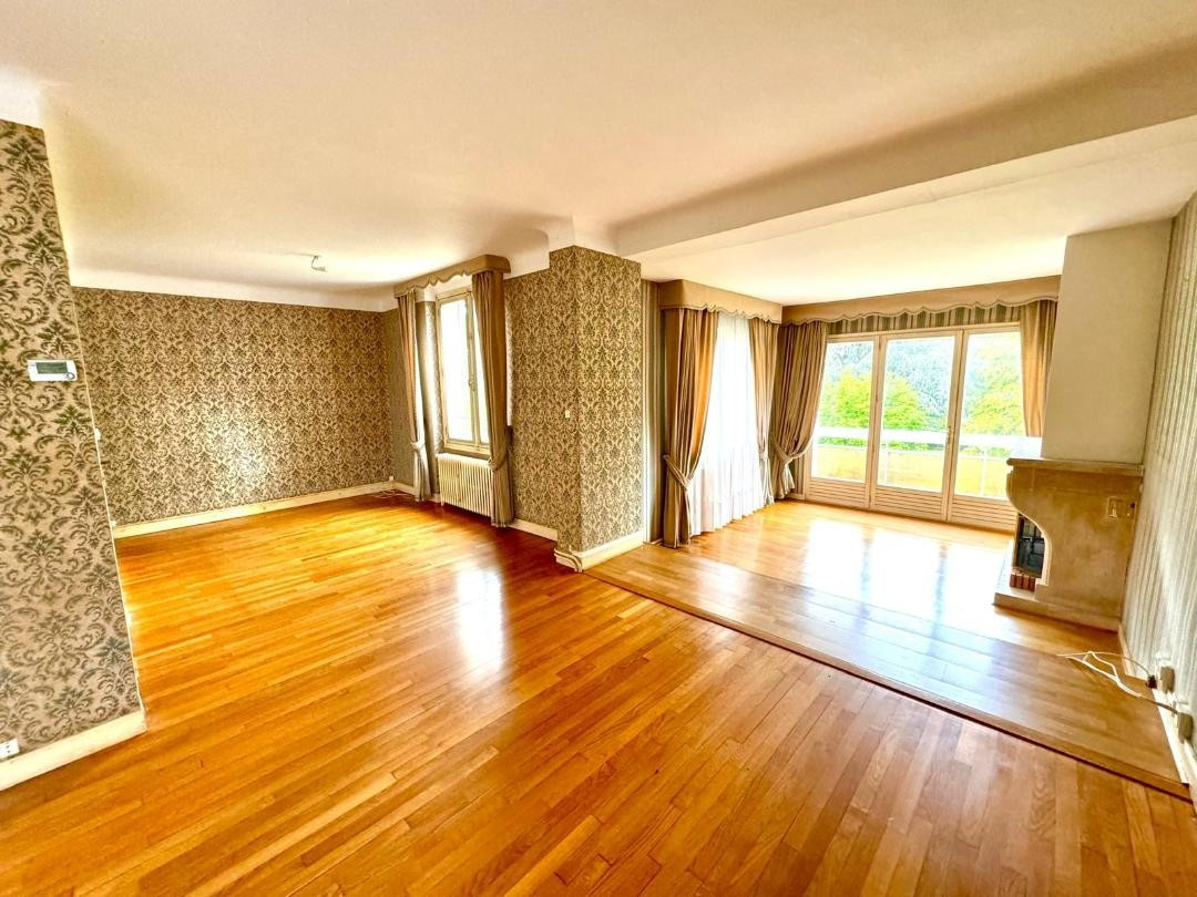 À l’étage, un grand palier dessert une cuisine aménagée, une seconde pièce de vie salon-salle à manger lumineuse de plus de 40 m2 avec cheminée, parquet chêne et balcon avec vue sur le parc, deux autres chambres, une seconde salle d’eau et un wc.